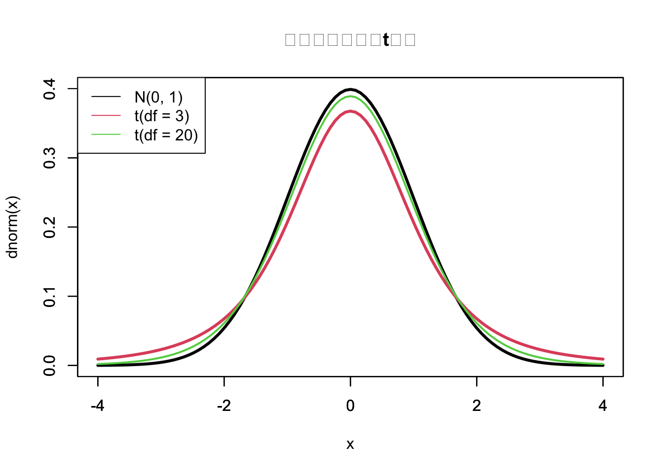 信頼区間を求めるための手順は標準正規分布の場合もt分布の場合も同様だが、標準正規分布のかわりに t 分布を用いた場合、特定の確率に対応する閾値が変わることが知られている(\(\small z_{\alpha/2}\neq t_{\alpha/2}(n-1)\))。 t分布は、左右対称であり標準正規分布よりもテールが厚いという特徴を持つが、自由度が大きくなると正規分布に近づくことが知られている。標準正規分布と、自由度の異なる t 分布との関係は以下のように図示化できる。自由度(df)3の t 分布よりも自由度20の t 分布のほうが標準正規分布に近い形状であることが伺える。
