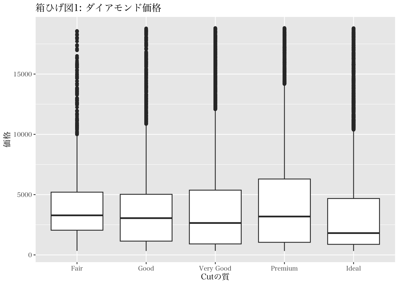 次に、箱ひげ図の作り方を紹介する。箱ひげ図は、四分位数と四分位範囲等を図示化したものである。四分位数はデータを4等分する区切りの値であり、第一四分位はQ1、第二四分位はQ2、第三四分位はQ3、最大値はQ4で示される。四分位範囲はQ3-Q1の範囲で示されるものである。ここでは、Cutの質(Fair, Good, Very Good, Premium, Ideal)ごとに価格の分布を比べるため、複数の箱ひげ図を並べる例を提示する。