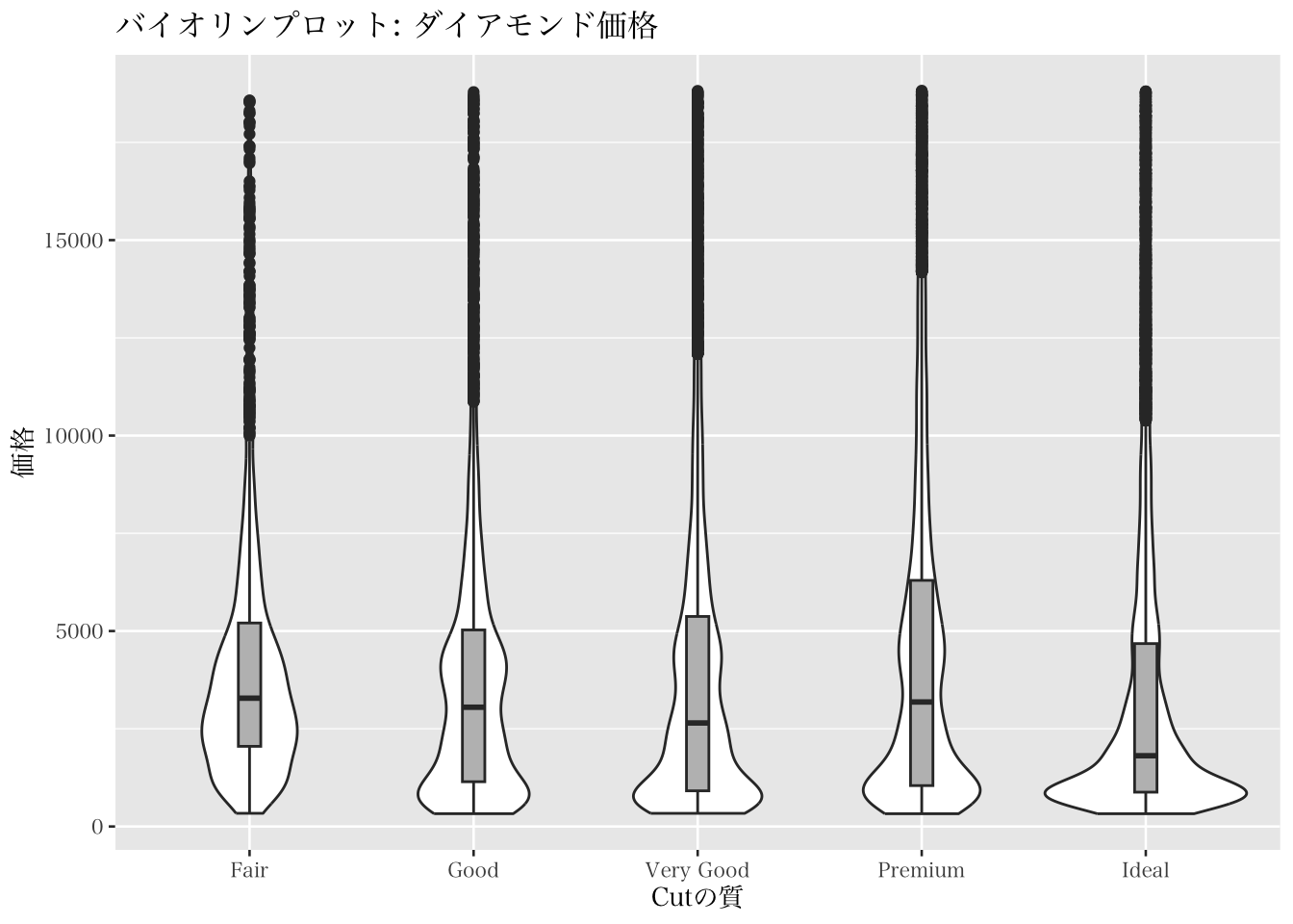 次に紹介する図のタイプはバイオリンプロットである。バイオリンプロットは、箱ひげ図よりももう少し詳しくデータの分布を確認できる図である。ggplot2では、geom_violin() を用いる。例えば、先程の箱ひげ図をバイオリンプロットで示すと、以下のようになる。以下の図は、バイオリンプロット内に箱ひげ図を示すことでよりわかりやすい図を作成するように工夫している。