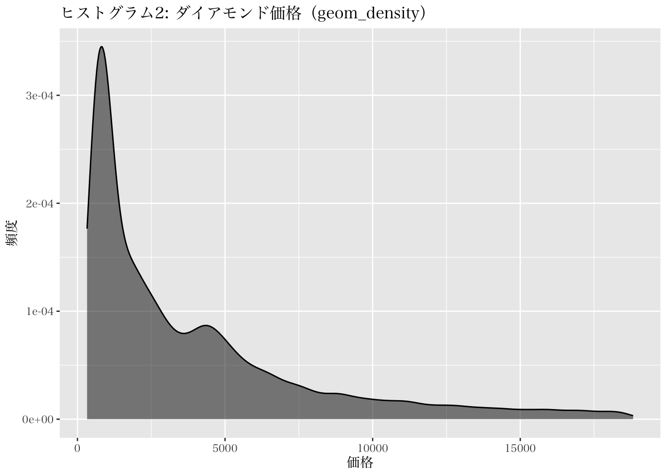 title = "ヒストグラム2: ダイアモンド価格(geom_density)")