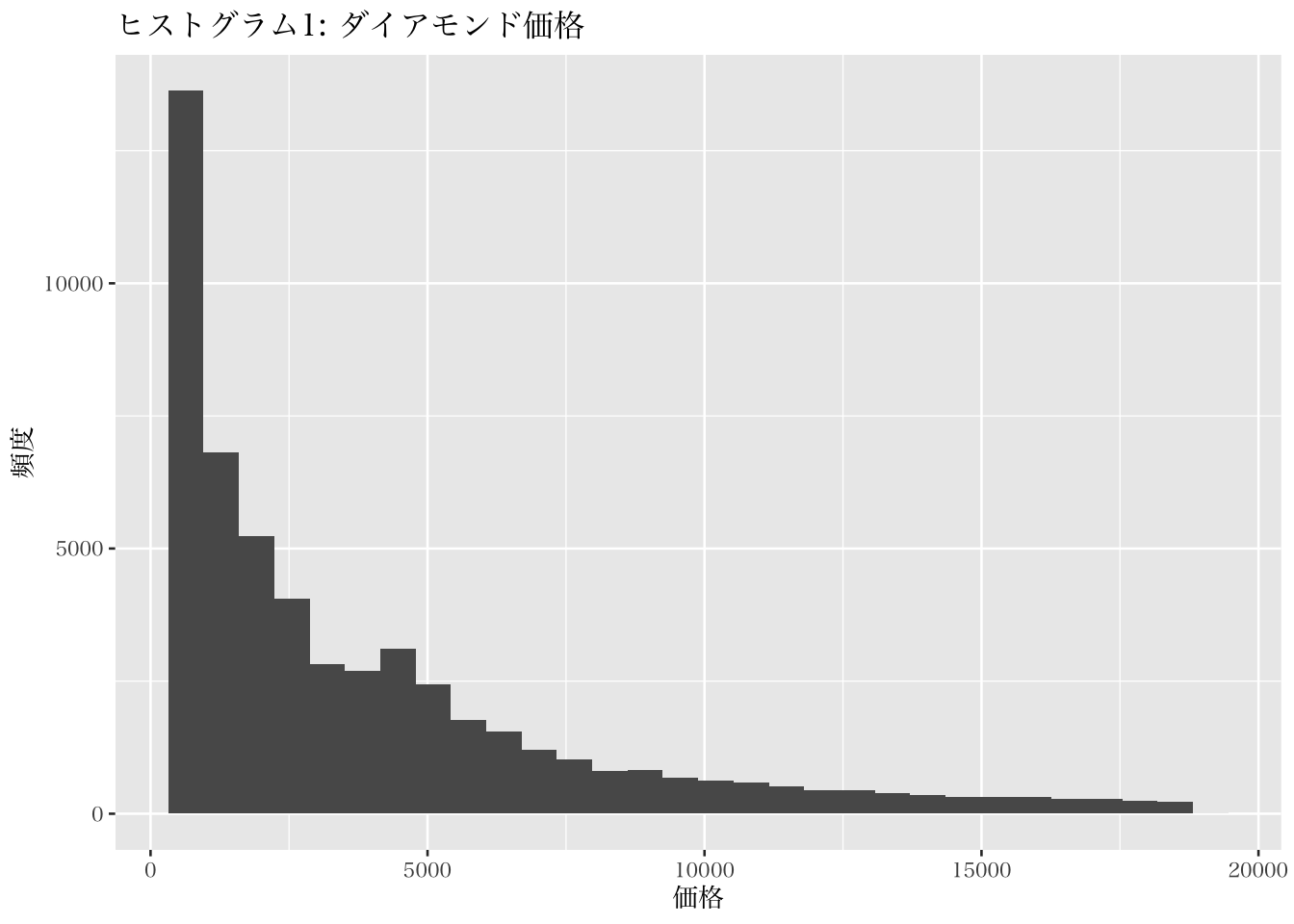 ggplot2を用いたデータ可視化の例として、まずはヒストグラムを描画する。ヒストグラムはデータの分布を離散的に示すものであり、連続変数を階級で分けて各階級の頻度を図示化する。ヒストグラムは一つの変数を扱った図なので、mapping引数ではひとつの変数を指定する。その上で作成した図示化オブジェクトに geom_histogram() を追加することでヒストグラムを描画する。以下では、ダイアモンドの価格の観測頻度についての可視化例を紹介する。以下の図では、価格の程度を離散的に区切り、その区切られた各範囲の価格を取る観測がデータ内にどれだけ存在するかを示している。